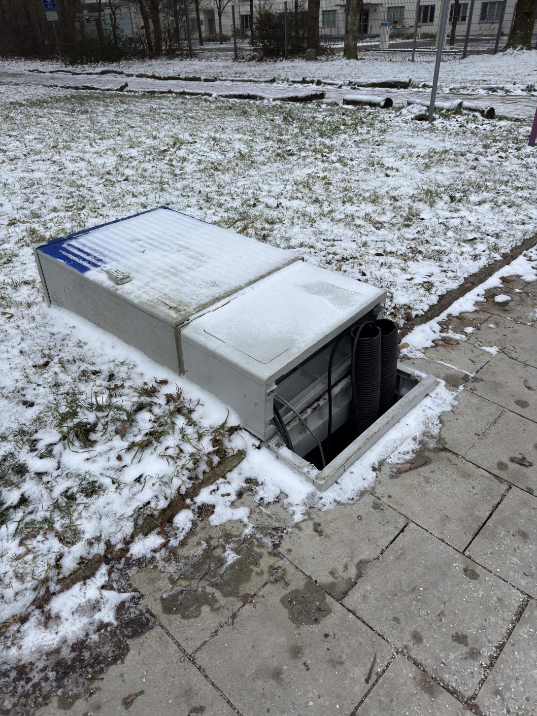Der Trennkasten oder ein anderer Schaltkasten ist aus Verankerung gerissen, Kabel liegen offen. Schaut aus als wäre Kasten umgezreten worden