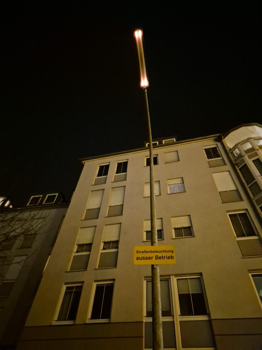 Der Mast hat ein Schild darauf, dass er außer Betrieb ist. Tatsächlich ist er aber ab, nur das Leuchtmittel ist kaputt. Bitte genaue Markerposition beachten