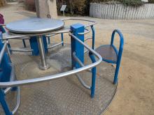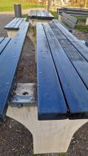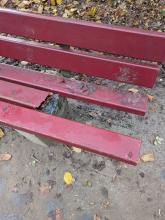 Diverse Latten an Tischen sind morsch, lose, mit Pilzen befallen oder liegen bereits im Park verteilt