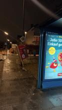 Ostpreußenstraße, Laterne an Kreuzung Memeler Str. leuchtet nicht. Mastnummer wohl 27, ist mit Werbung überklebt