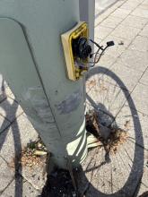 Beschädigung an der gelben Taste festgestellt (offenes Gehäuse, Kabel ragen aus der „Box“, Funktion eingeschränkt).