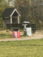 Alle Mülleimer im Park sind nicht mehr aufgehängt sondern stehen direkt auf dem Boden; Gefahr für kleine Kinder