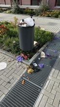 Ein großer Müllgittereimer wurde seit Wochen nicht geleert und langsam wird der Müll daneben gesammelt.