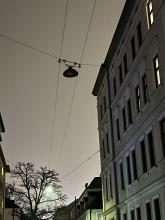 Eine Lampe am Mast hinter der Straßenbahnhaltestelle Lenbachplatz ist defekt
