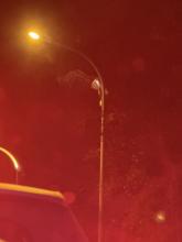 Laterne Nr. 11: beide Leuchtstoffröhren glimmen nur noch sehr dunkel. Straße dunkel