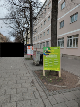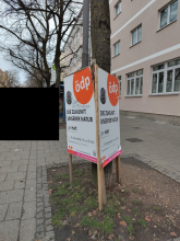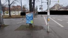 Temporäres Straßenschild steht seit mittlerweile fast 2 Jahren ungenutzt auf dem Gehweg.