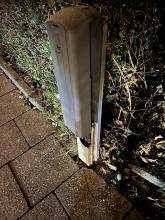 Stromverteilerkasten, vermutlich für Stassenlaternen, beschädigt. Standort: Gehweg Kapruner Str. Ecke Mitterfeldstasse.
