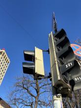 Die Fußgängerampel hängt so zur Seite verdreht, dass man sie von der gegenüberliegenden Seite zum Überqueren der Straße nicht (wie sonst)