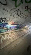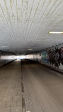Fußgängerunterführung sind die Lampen zum Teil schwarz besprüht worden und darum weniger Licht