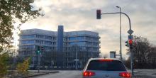 Fußgängerampel nicht mehr sichtbar da verdreht. Provisorische Ausfahrt vom BMW Wolfsgelände.