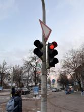 Ampel für die Autos komplett verdreht und zeigt in Richtung der Fußgänger