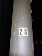 Kein Mast, Lampen hängen an Seilen. Zwei Lampen defekt. Höhe HsNr 18 und 20