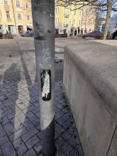 Am Beleuchtungsmast beim U-Bahneingang (Rolltreppe) Am Harras/Plinganserstrasse ist die Abdeckung zu den Stromleitungen abgerissen
